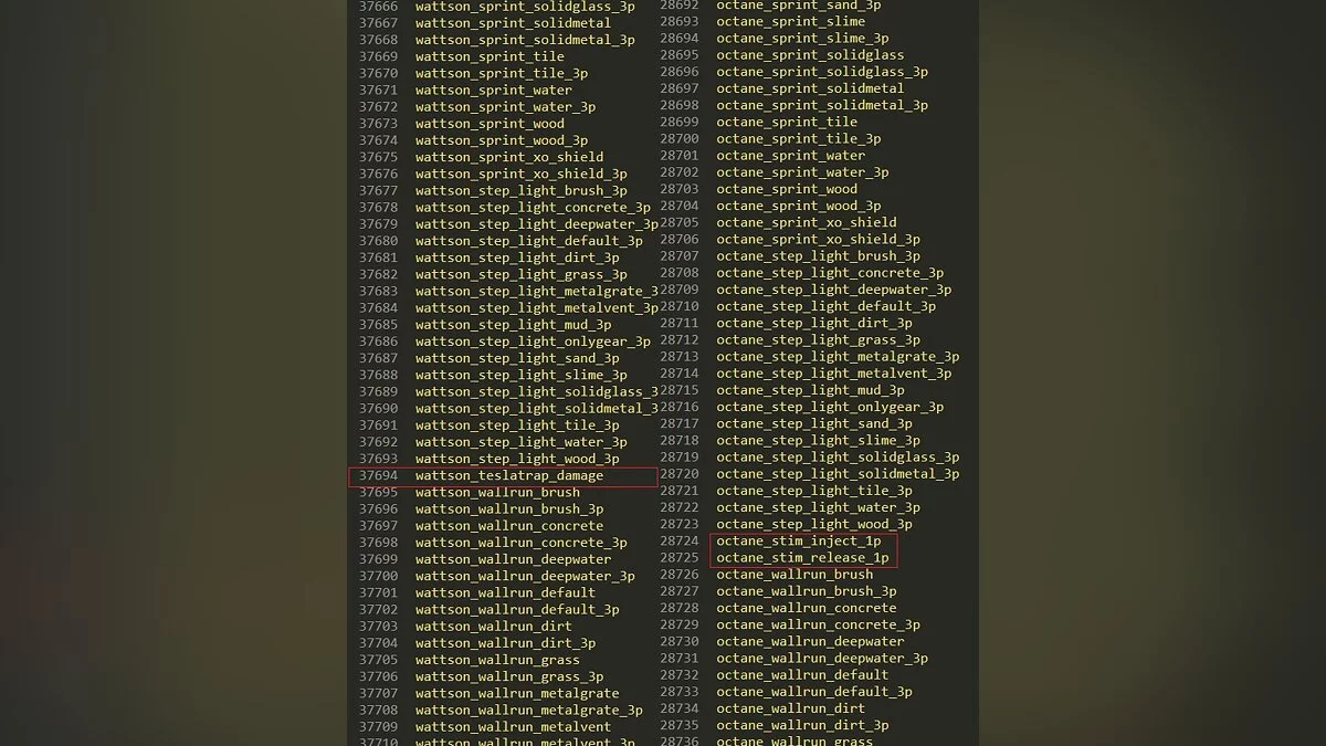 В найденном списке можно найти два уникальных имени: Ватсон (Wattson) и Октейн (Octane). Так как почти все имена персонажей каким-либо образом связаны с их умениями, фанаты долго пытались угадать, что они смогут делать.