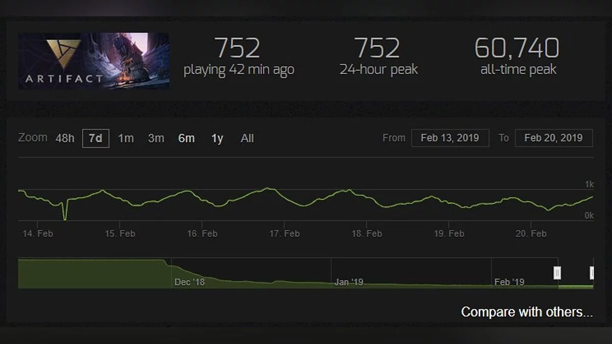 Тем временем Artifact продолжает бить анти-рекорды по посещаемости. Согласно данным SteamCharts, сегодня максимальный онлайн составил 752 игрока.