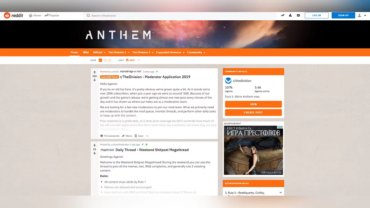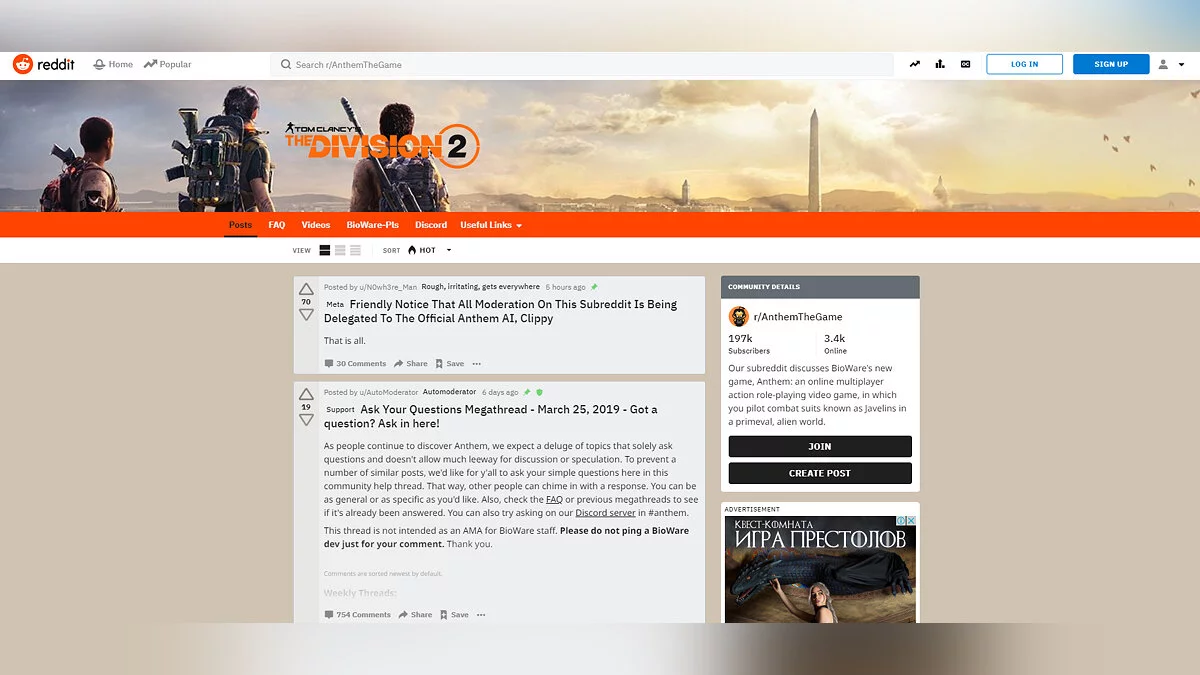 Если перейти прямо сейчас на страничку Anthem на Reddit, на экране появится логотип The Division 2. Если же перейти на страничку The Division 2, то пользователи увидят изображение Anthem.