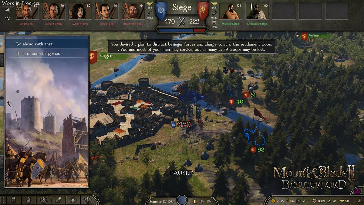 У защитников тоже есть, из чего выбрать: попавший под осаду лорд может ждать за стенами в надежде на победу, прорваться сквозь армию врага с минимальными потерями (если нужно сбежать) или вообще договориться с устроившим осаду лордом, отдав ему замок взамен на жизнь своих людей и своей в том числе.