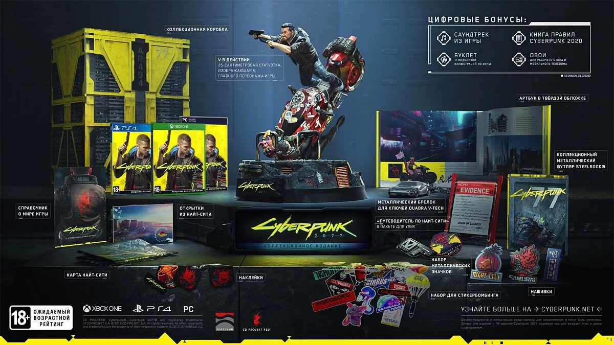 Напоминаем, Cyberpunk 2077 выйдет 16 апреля 2020 года. В коллекционное издание входят стилбук, статуэтка главного героя (25 см), артбук, металлические значки, «Путеводитель по Найт-Сити», нашивки, открытки, карта города, стикеры, справочник по игре и цифровые бонусы.