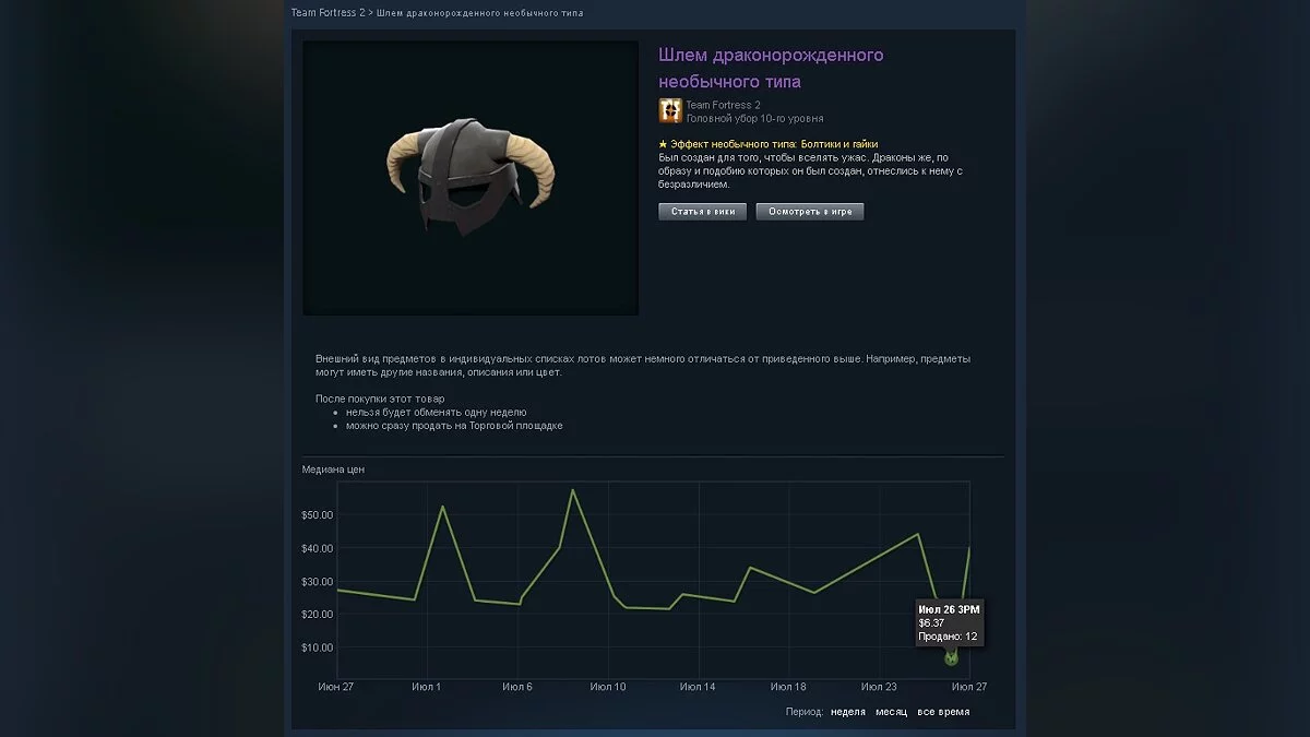 А вот цены на «необычные» предметы резко упали. Недавно шлем Драконорожденного из TES 5: Skyrim стоил почти $40, однако теперь его начальная цена — $15. Всего было продано 122 шлема, что в сто раз больше, чем обычно.