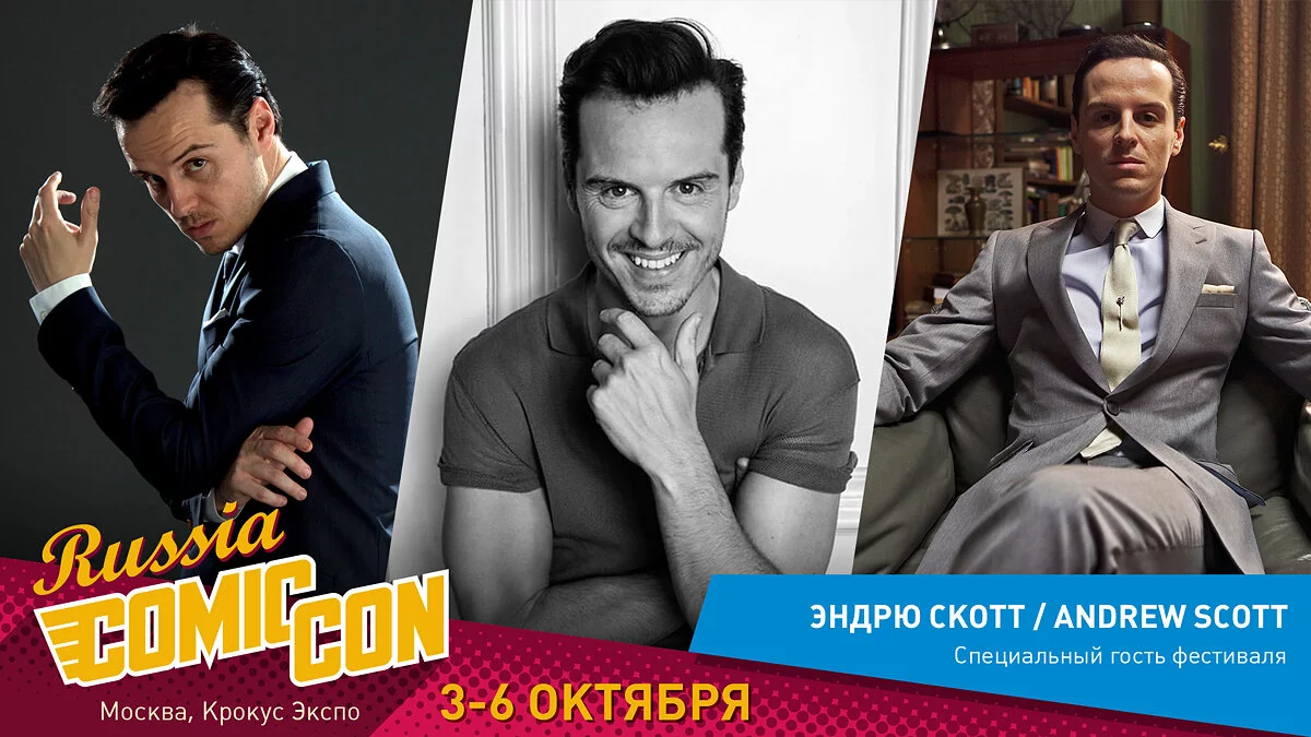 Актёр Эндрю Скотт (Andrew Scott), известный по роли Мориарти в сериале «Шерлок» от BBC, приедет как специальный гость на фестиваль Comic Con Russia 2019.