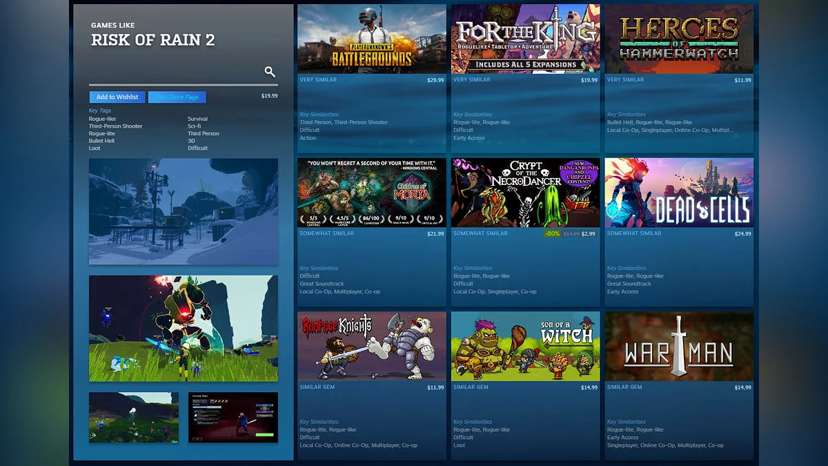 «Погружение» составляет список из девяти игр, которые смахивают на ту, что искал пользователь. При этом перечень разделён по уровням от очень до отчасти похожих. Это позволит игрокам глубже исследовать каталог Steam.