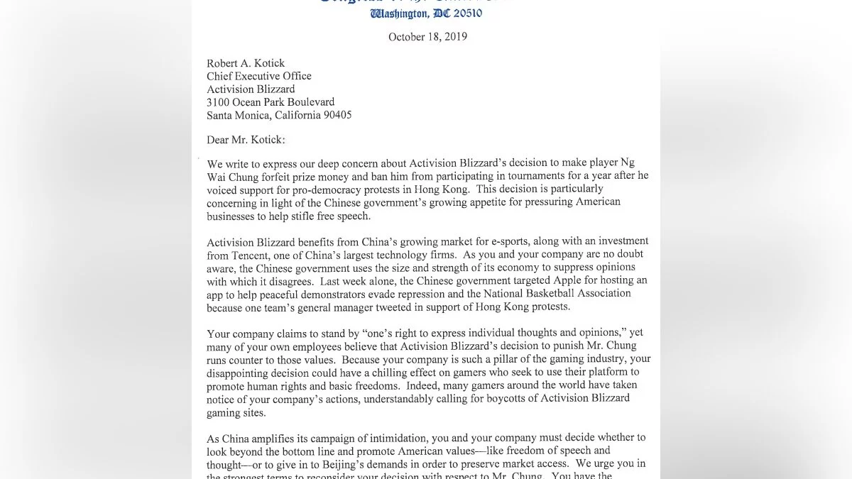 Сенаторы также упоминают отдельных сотрудников Blizzard, выступивших против бана, и бойкот ряда игроков. Политики просят главу Activision Blizzard определиться с желанием либо продвигать американские ценности, либо подчиняться Китаю ради доступа к рынку.