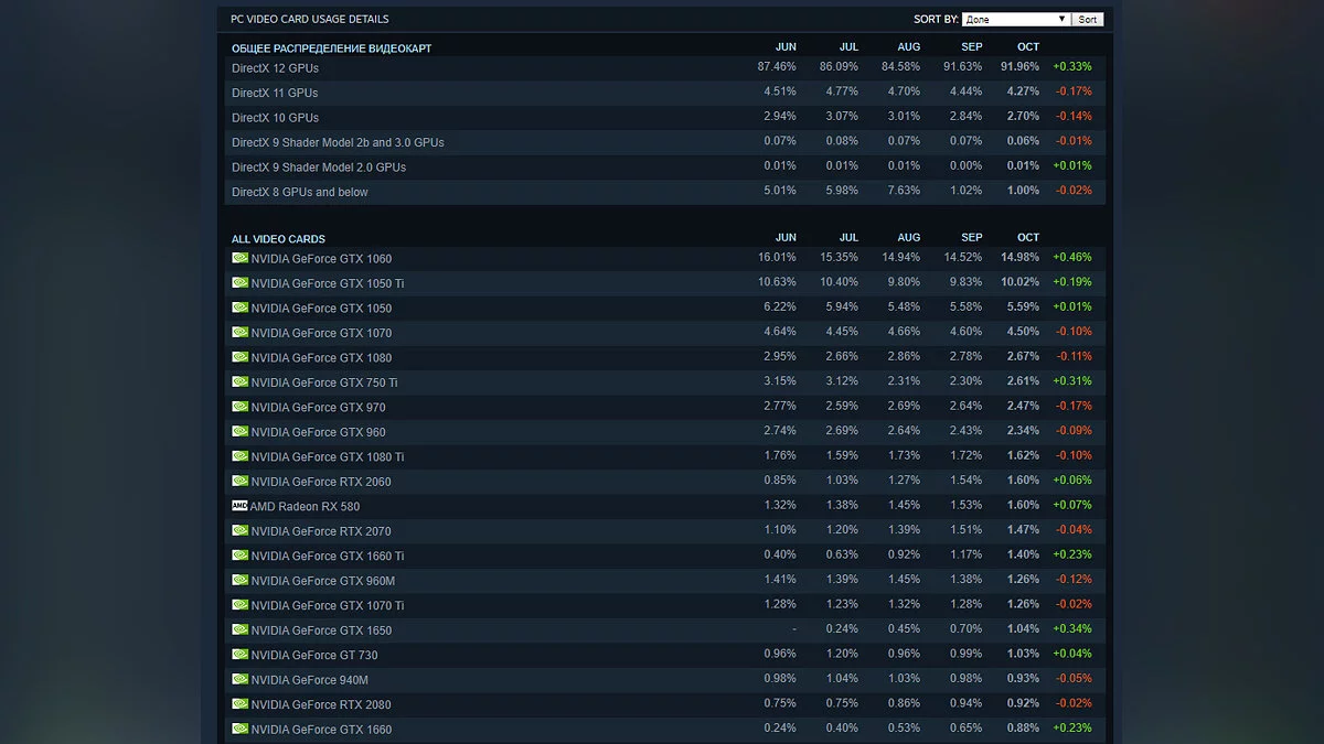 На первом месте среди видеокарт по-прежнему находится GTX 1060. Более того, она укрепила свои позиции на 0,46% (14,98% в целом). Второе и третье место достались GTX 1050 Ti (10,02%) и GTX 1050 (5,59%).