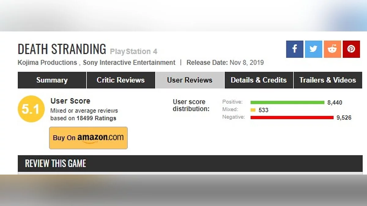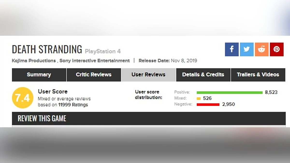 Пользователи Reddit заметили, что Metacritic удалил более трети негативных оценок Death Stranding.