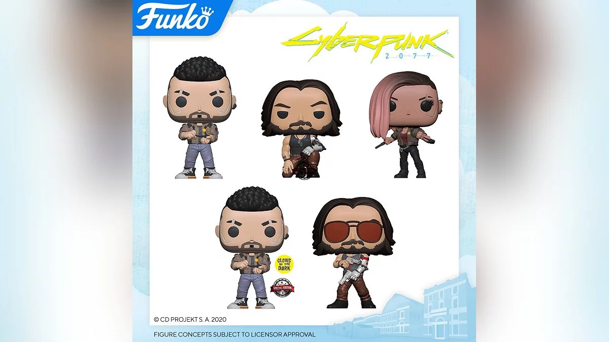 Компания Funko показала коллекционные фигурки персонажей Cyberpunk 2077, включая Джонни Сильверхенда (в двух вариациях) в исполнении Киану Ривза (Keanu Reeves), Такемуру, а также мужскую и женскую версии главного персонажа по имени Ви.