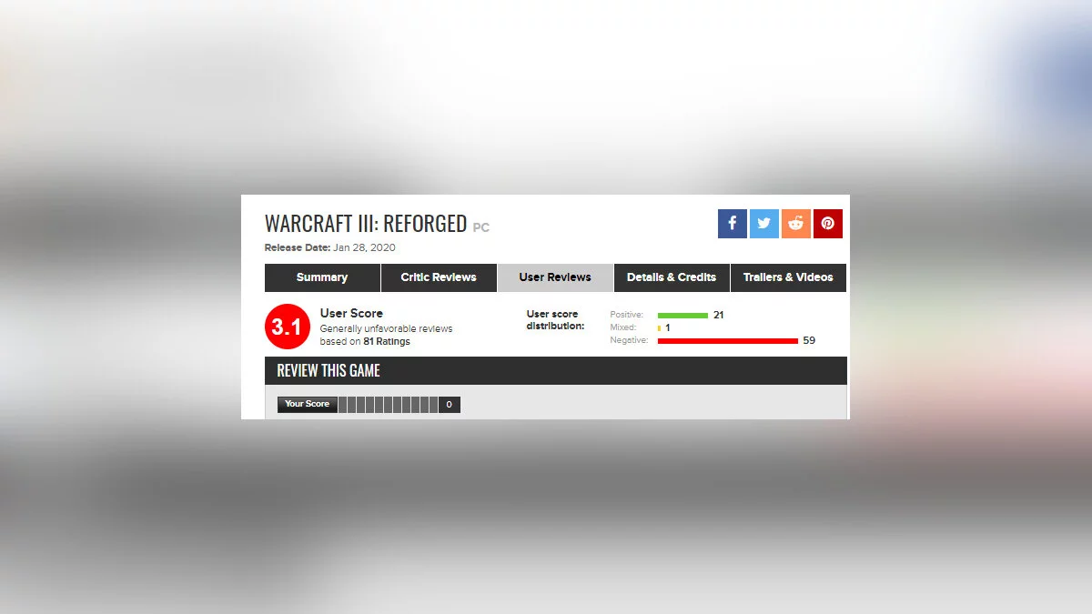 Несмотря на то, что некоторые игроки отозвались об игре достаточно положительно, Warcraft 3: Reforged в основном получила негативные отзывы. На момент написания новости ее средняя пользовательская оценка составляет 3,1 балл. Из минусов многие игроки, как правило, выделяют плохое качество игры и баги.