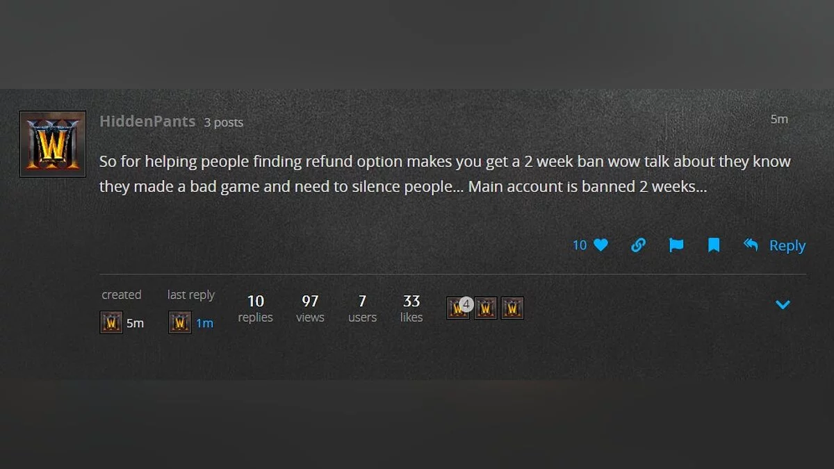 Реддитор под ником The_Vinlander опубликовал сообщение одного из пользователей форума Blizzard. В сообщении он утверждает, что компания забанила его аккаунт на две недели лишь за то, что он пытался помочь оформить рефанд.