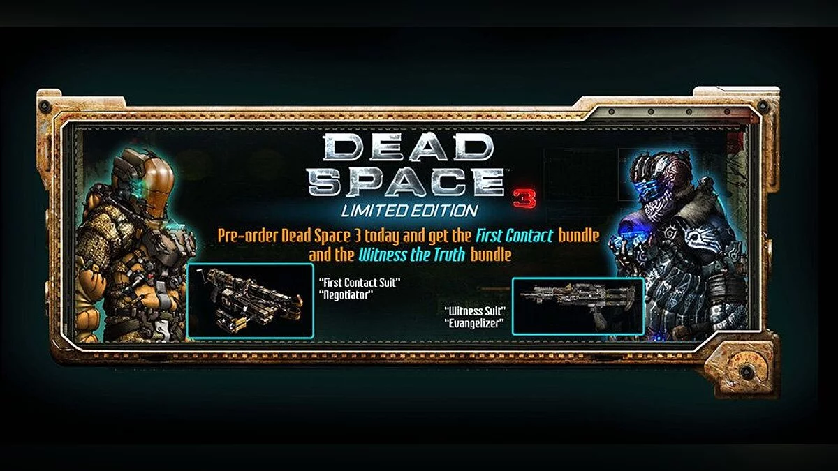 В свою очередь, компания Electronic Arts анонсировала Dead Space 3 Limited Edition, которое можно купить только в Origin за 1000 рублей. В качестве бонуса покупатели получат два специализированных костюма (Костюм Свидетеля и Костюм Контактера), и по винтовке к каждому из них (Оружие «Евангелист» и Оружие «Переговорщик»).