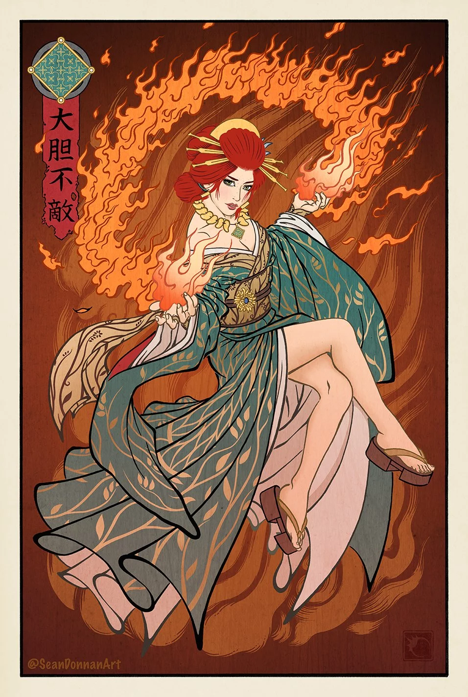 Американский художник Шон Доннан (Sean Donnan) решил преобразить образы популярных персонажей из серии игр The Witcher. Так, он нарисовал Геральта, Цири, Йеннифэр и Трисс в стиле японскиx средневековых гравюр.