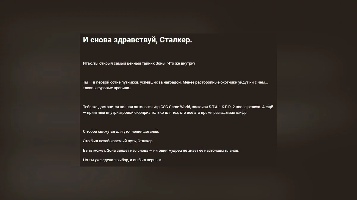В конце квеста игроков ждал приятный сюрприз — первой сотне отгадавших GSC Game World вручила полную антологию игры вместе со S.T.A.L.K.E.R. 2, которую подарят на релизе. Более того, победителям также достанется уникальный внутриигровой предмет, который разработчики пока не раскрыли.