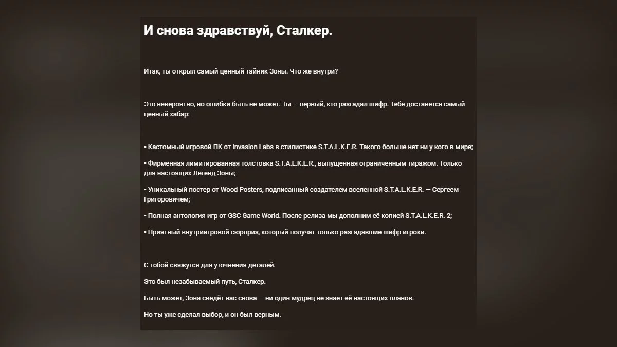 Авторы S.T.A.L.K.E.R. 2 раскрыли вторую часть шифра. Теперь фанаты могут выиграть главный приз -