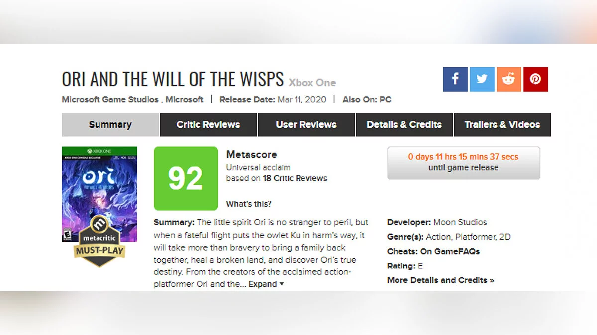 На момент написания новости Ori and the Will of the Wisps имеет 92 балла из 100 возможных. Сейчас это одна из лучших игр 2020 года. Ее релиз состоится 11 марта на PC и Xbox One.