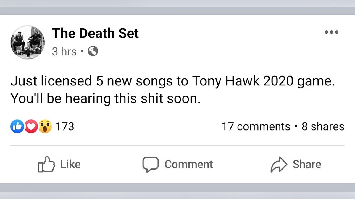 Кажется, совсем скоро нас ждет анонс новой части Tony Hawk. Панк-рок группа The Death Set рассказала в Facebook, что ее песни прозвучат в грядущем симуляторе скейтбордиста.