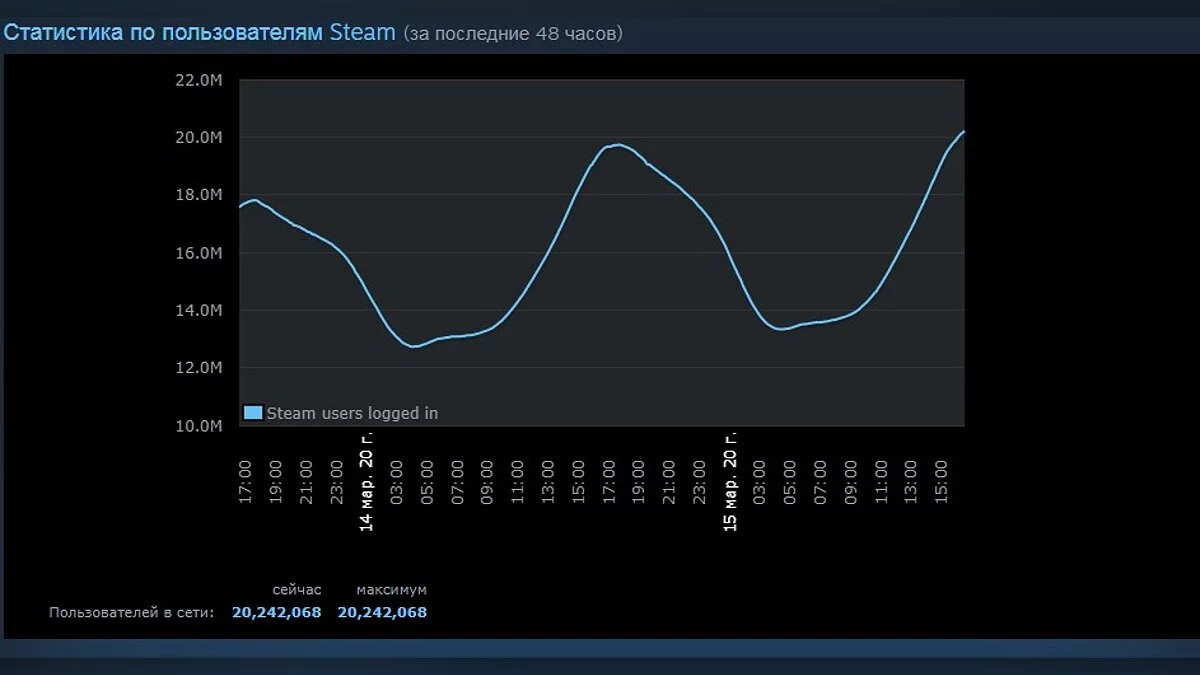 Официальная статистика Steam показала, что 15 марта в 16:50 МСК число пользователей онлайн составило 20 242 068. Более 6,2 млн из них находятся в играх. Многопользовательский шутер компании Counter-Strike: Global Offensive днем ранее тоже поставил рекорд по количеству игроков в онлайне — 1 016 000 человек.