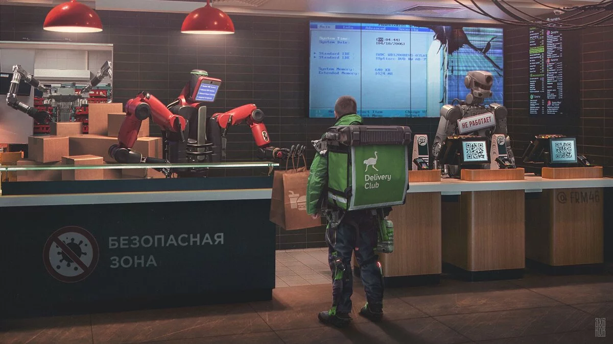 На изображениях можно увидеть, как курьеры бесконтактно доставляют пиццу, получают заказы от роботов и дезинфицируют руки от летающих распылителей.