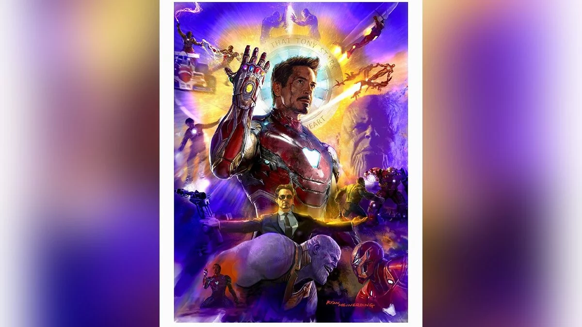Дизайнер персонажей и концепт-художник Marvel Studios Райан Мейндеринг (Ryan Meinerding) решил поздравить Роберта Дауни-мл. с 55-летием, опубликовал в Twitter красивый арт с фрагментами из жизни Железного человека в фильмах.
