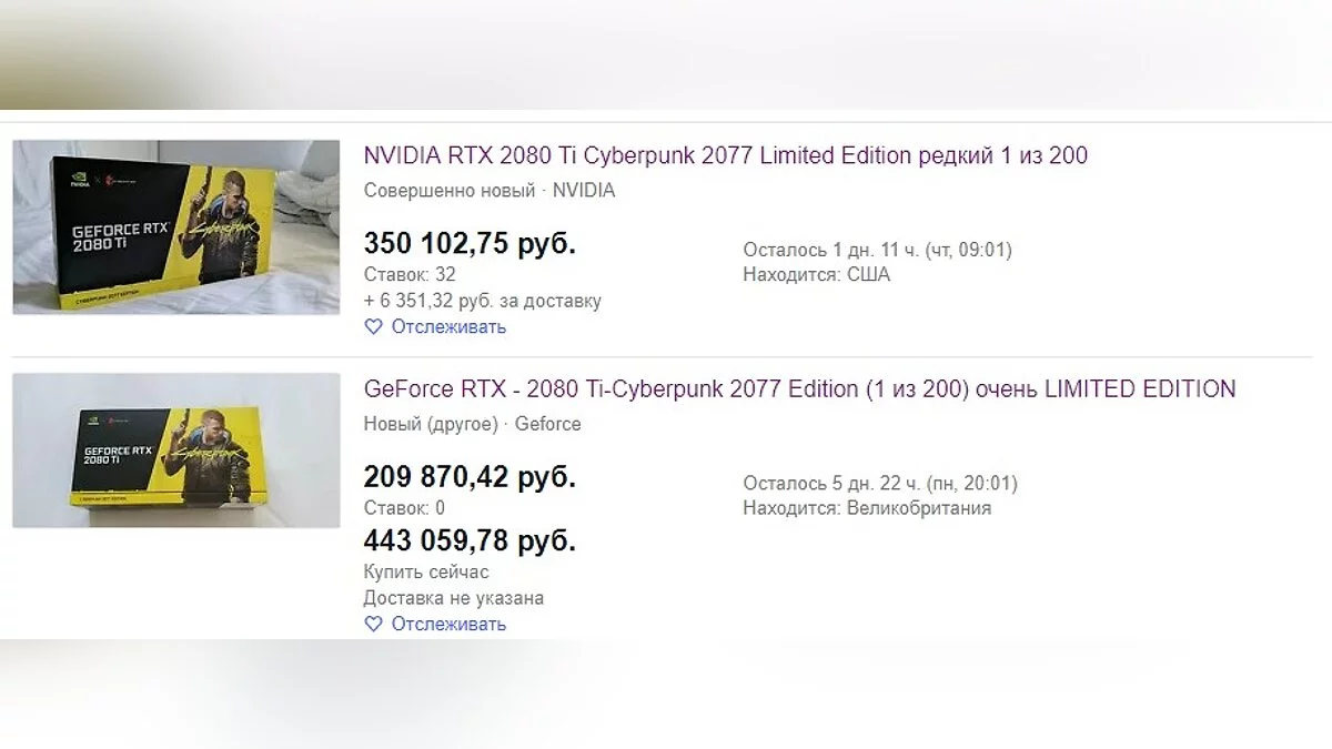 В феврале CD Projekt Red и Nvidia анонсировали ограниченную серию видеокарт GeForce RTX 2080 Ti в расцветке Cyberpunk 2077. Как сообщает PC Gamer, они уже продаются на eBay и стоят баснословных денег.