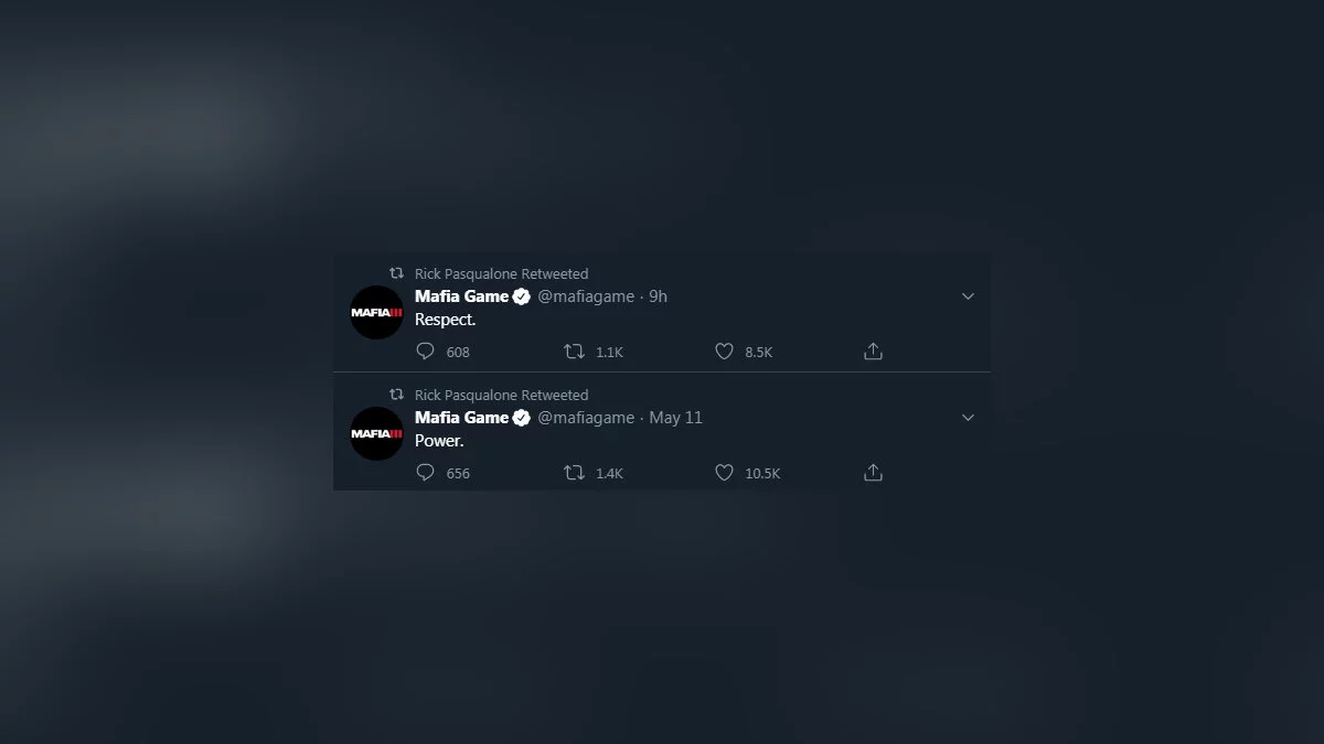 В официальном аккаунте Mafia с 10 мая появляются тизеры. Первое сообщение состояло из одного слова — Family («Семья»). Далее разработчики опубликовали слово Power («Сила»), а в новом тизере — Respect («Уважение»).