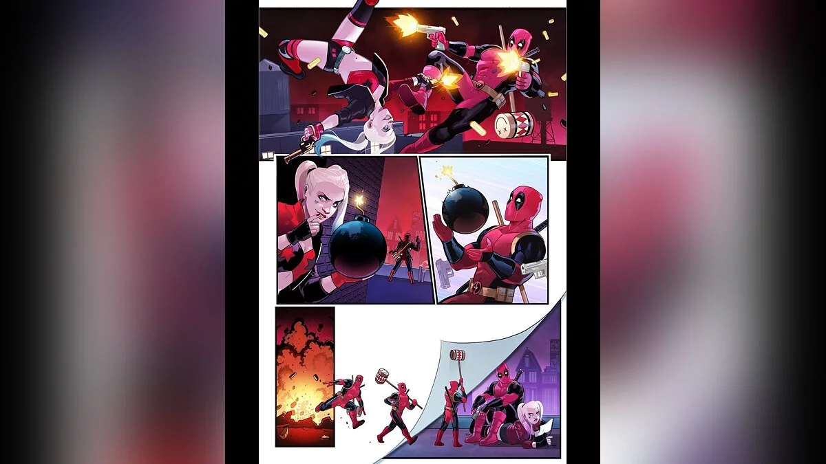 В комиксе показано, как Харли Квинн и Дэдпул сначала стреляют друг в друга, но это не дает никакого результата. Затем героиня из DC-вселенной решила вручить своему противнику подарок — бомбу, которая взорвалась, но так и не нанесла ему существенного урона. В конце, к слову, персонажи перестали сражаться, а Дэдпул и вовсе уселся верхом на Харли Квинн.