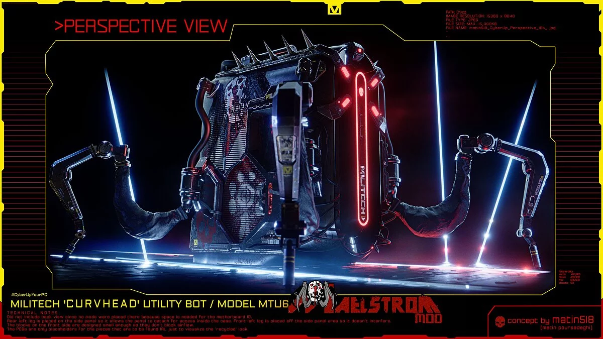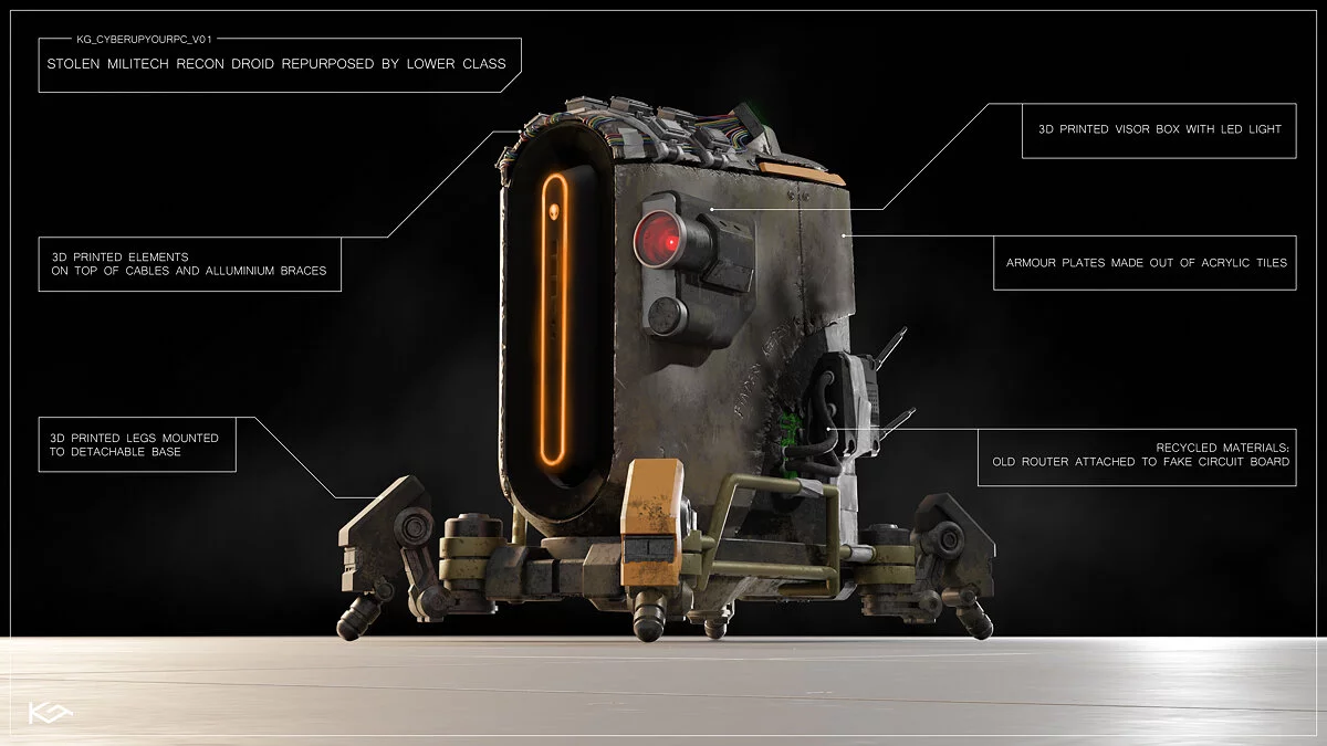 Согласно правилам конкурса, корпус должен иметь как минимум один элемент из переработанных материалов, а также логотип банды или мегакорпорации. Отметим, что участникам требовалось просто нарисовать корпус, а не сделать его вручную.