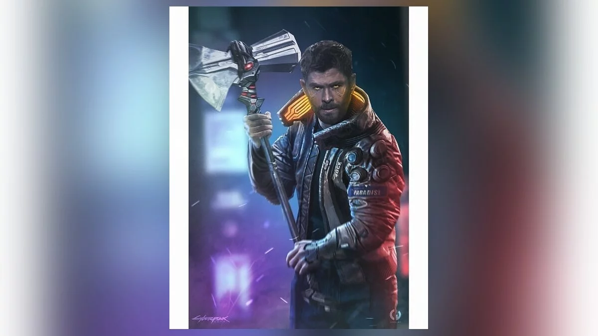Французский цифровой художник Camille Vialet (признано в России экстремистской организацией) опубликовал арт, на котором показал, как мог бы выглядеть Тор из «Мстителей», если бы появился в Cyberpunk 2077.