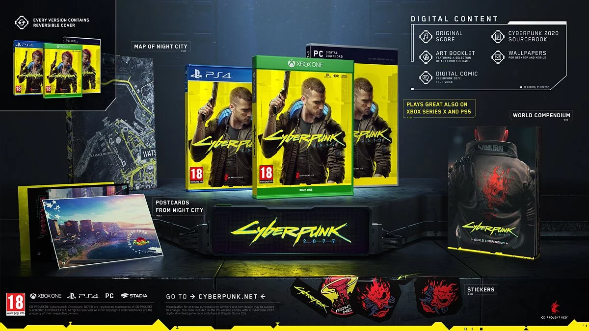 Как и в случае с The Witcher 3, обладатели физической копии шутера получат в подарок компендиум, карту Найт-Сити, несколько открыток и наклеек. Стоит отметить, что обложка «Киберпанка» двухсторонняя: с одной стороны на ней нарисован главный герой мужского пола, с другой — женского.