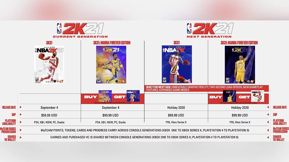На изображении для NBA 2K21 можно увидеть расценки для текущего и следующего поколения консолей. За версии для PS5 и Xbox Series X просят 69,99 $, когда стоимость для Switch, PS4 и Xbox One составит 59,99 $.