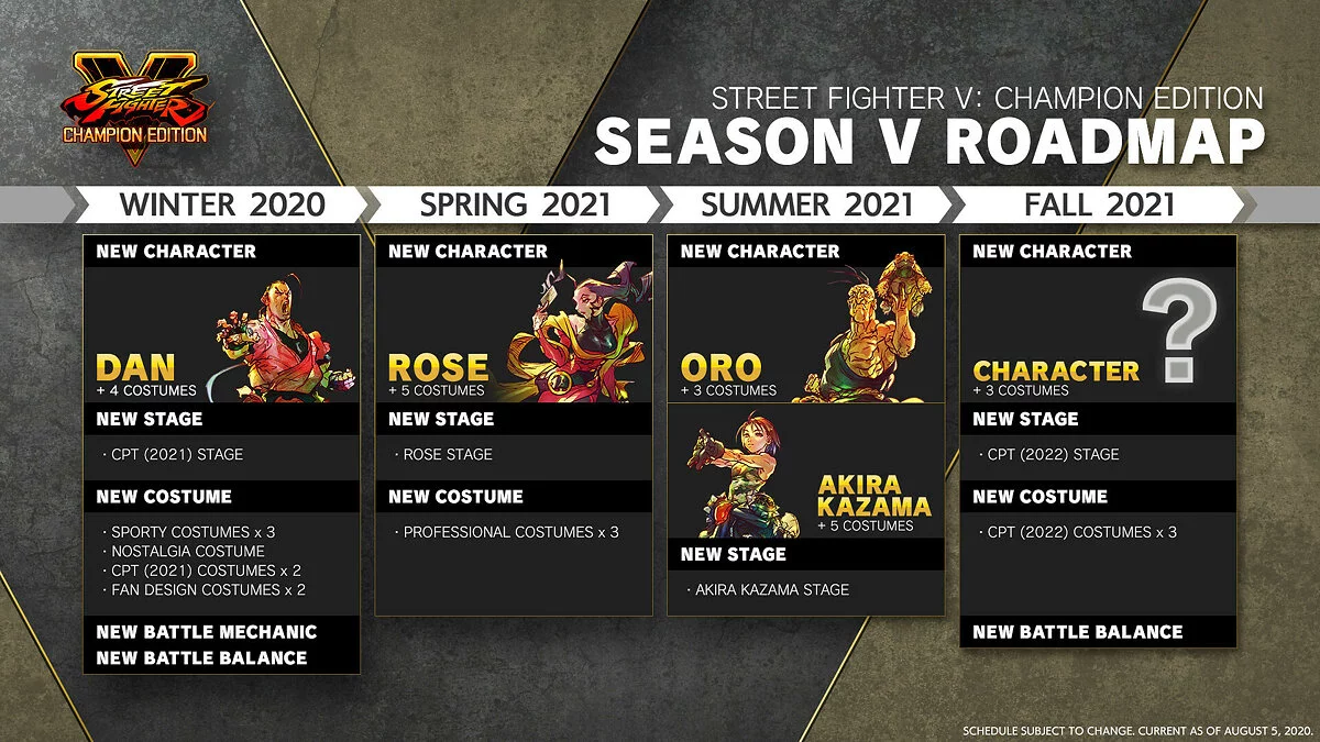 Сегодня Capcom представила контент-план пятого заключительного сезона Street Fighter 5: Champion Edition. В файтинге появится пять бойцов: Дэн Хибики, Роуз и Оро из предыдущих частей; Акира Казама из файтинга Rival Schools: United by Fate. Последнего бойца пока не раскрыли.