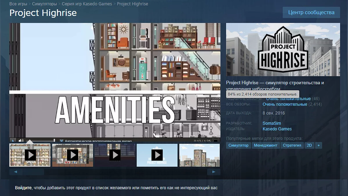 В Steam временно бесплатным стал симулятор строительства и управление собственным небоскребом Project Highrise, рейтинг которого составляет 84% положительных отзывов.