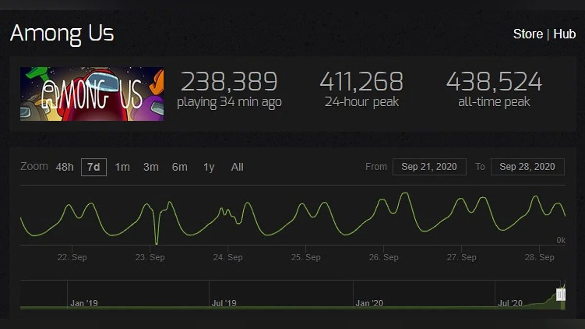 Многопользовательская игра Among Us появилась ещё в 2018 году, но лишь недавно стала очень популярной. По данным Steam, всего несколько минут назад в неё играли почти 240 тысяч человек, а пиковые показатели превосходят 438 тысяч пользователей.