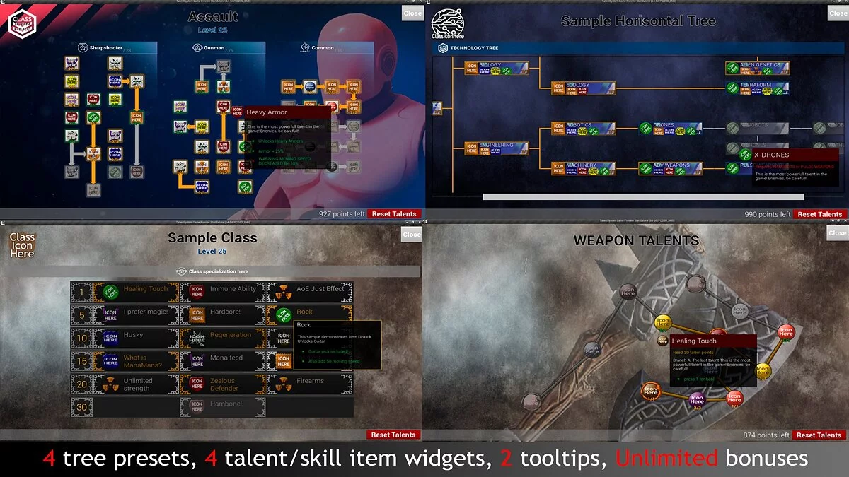 Система дерева талантов, на блупринтах и с детальными комментариями. Содержит 4 пресета деревьев (см. первый скрин)