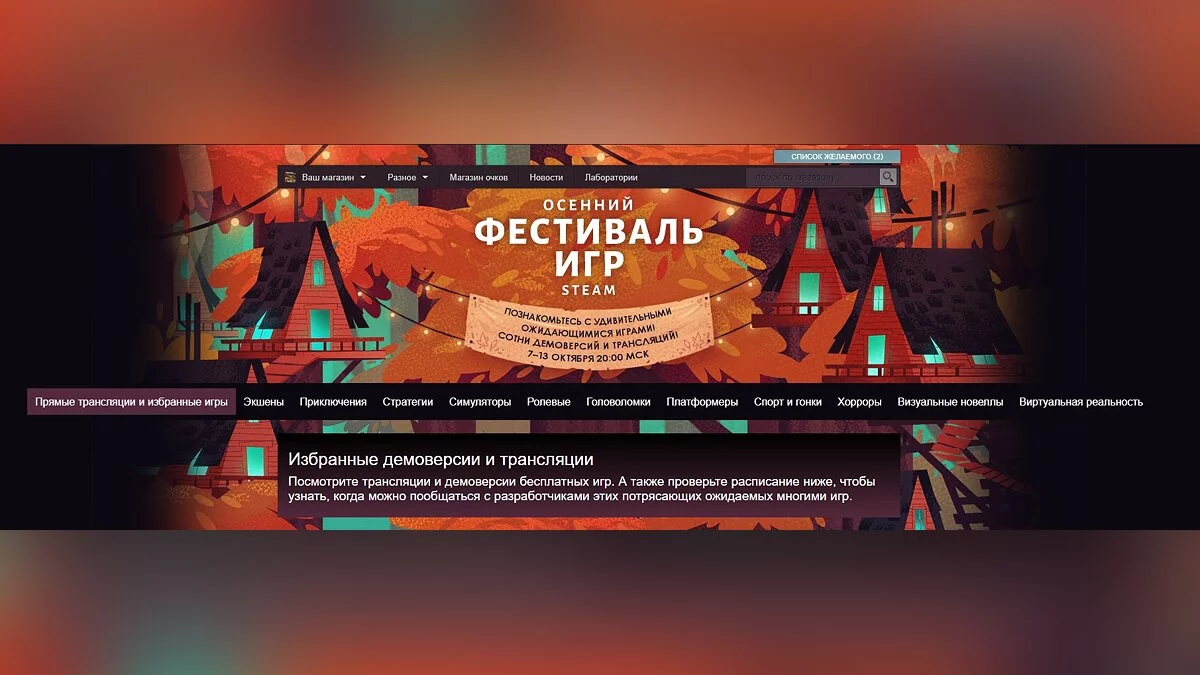 В Steam стартовал осенний фестиваль игр, который продлится до 13 октября. В рамках мероприятия игроки могут бесплатно опробовать сотни демоверсий предстоящих игр, а также пообщаться с их разработчиками во время трансляций.