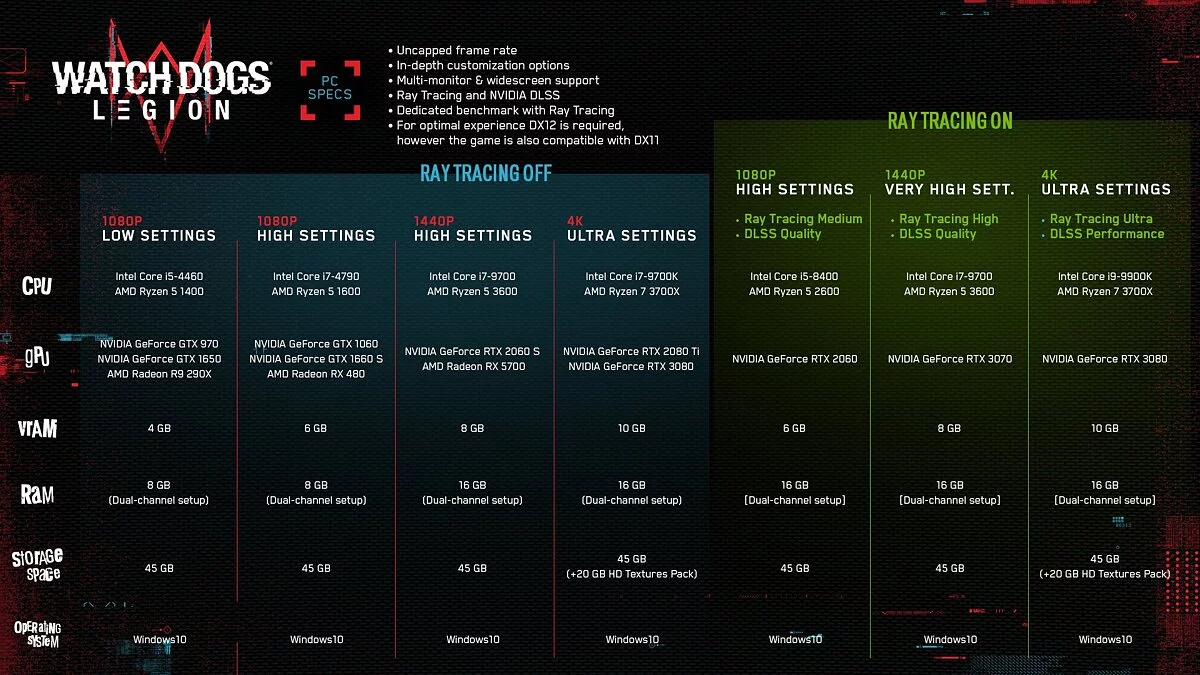Изменились только требования к процессорам и видеокартам. К примеру, чтобы поиграть в «Легион» на низких настройках графики, понадобится карточка уровня GeForce GTX 970. Раньше на её месте стояла GeForce GTX 960.