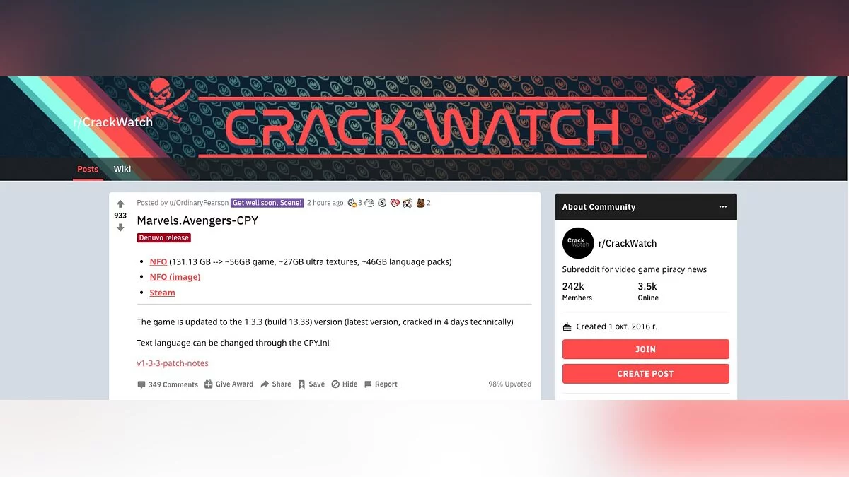 На момент написания заметки неизвестно, какая именно релиз-группа ответственна за взлом экшена во вселенной Marvel. Стоит также отметить, что в базе сайта CrackWatch все еще нет отметки о взломе Avengers.