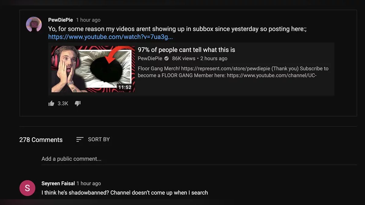 Из-за этого новый ролик PewDiePie не появился у его подписчиков, и его посмотрело гораздо меньшее количество человек, чем обычно. Сам Феликс Чельберг (Felix Kjellberg) не знает, в чем причина так называемого «тихого» бана. Чтобы видео заметили, он сделал пост в комьюнити своего канала.