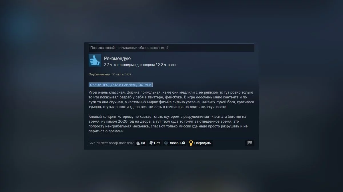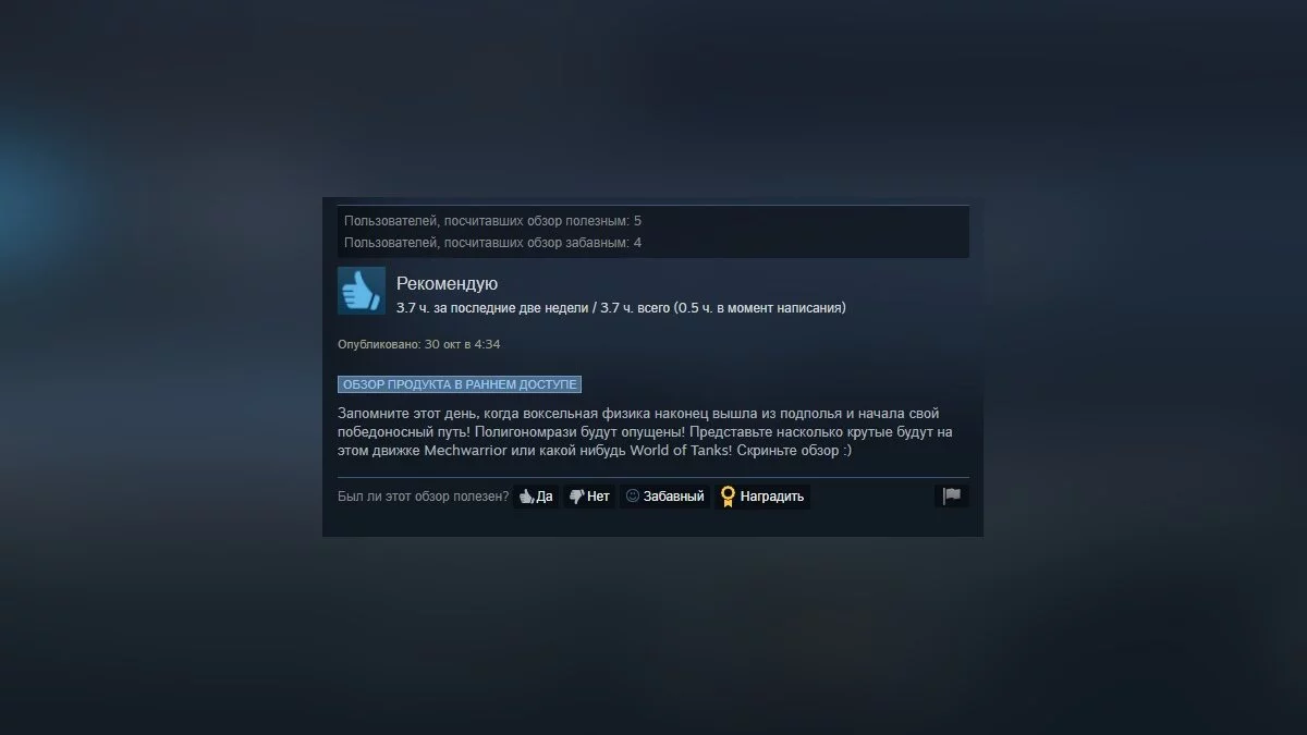 На данный момент Teardown имеет уже 96% положительных отзывов. Игру уже называют одной из лучших песочниц и советуют запомнить день релиза.