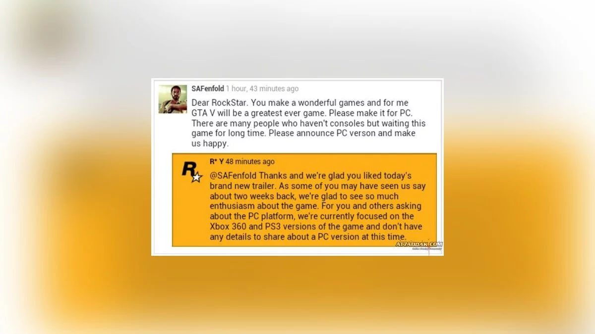 Rockstar Games анонсировала Grand Theft Auto 5 всего несколько недель назад, начав принимать предварительные заказы. Однако информация об игре не содержала даже намека на существование PC-версии. На плакатах мы видим логотипы Xbox 360 и PS3, но не PC. Вчера вышел второй трейлер и некоторые пользователи начали буквально душить Rockstar вопросами о PC-версии игры и отсутствии информации об этой версии в заявлениях Rockstar.