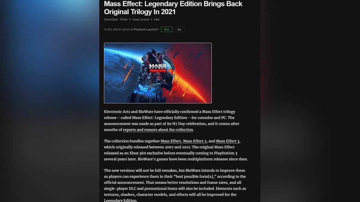 Раньше времени в сеть утек анонс ремастера трилогии Mass Effect: Legendary Edition — портал GameSpot случайно опубликовал статью, и быстро ее удалил.