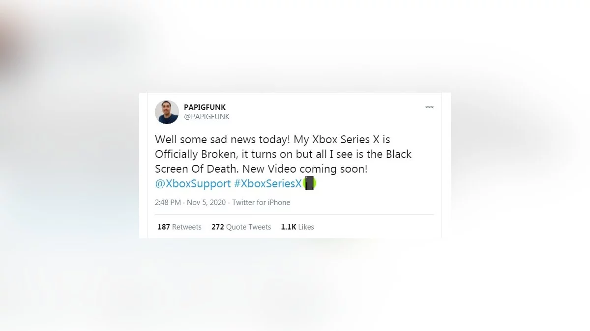 Ютубер под псевдонимом ThePapiGfunk, на которого подписано более 416 тыс. человек, рассказал в Twitter, что его консоль выдала «чёрный экран смерти». На следующий день он выложил ролик, где показал, что Xbox Series X не запускается.