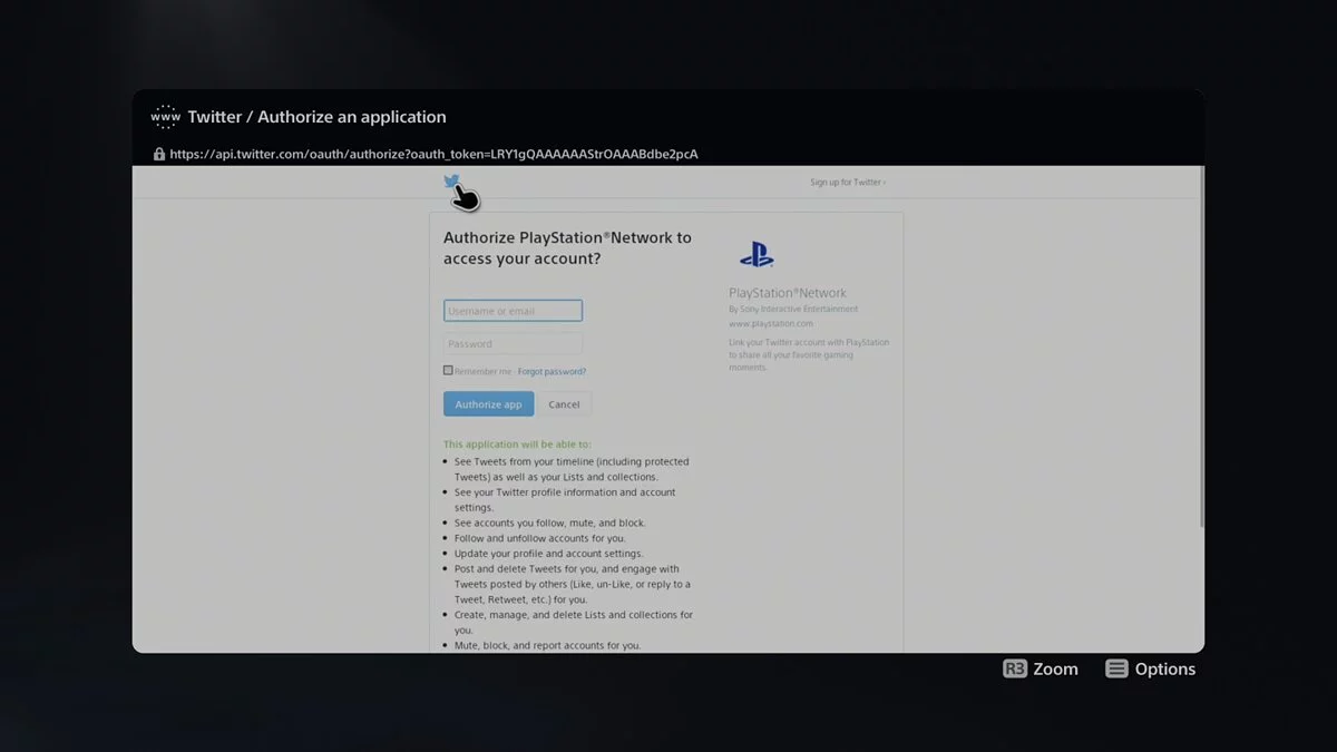 После этих действий откроется окно с просьбой авторизовать вашу учетную запись PlayStation Network. В это время необходимо нажать на логотип социальной сети в верхней части экрана, под адресной строкой. Далее необходимо войти в систему с учетной записью Twitter и перейти в аккаунт любимого ресурса. Ну а дальше все совсем просто: жмите на понравившуюся ссылку и наслаждайтесь полученным результатом.