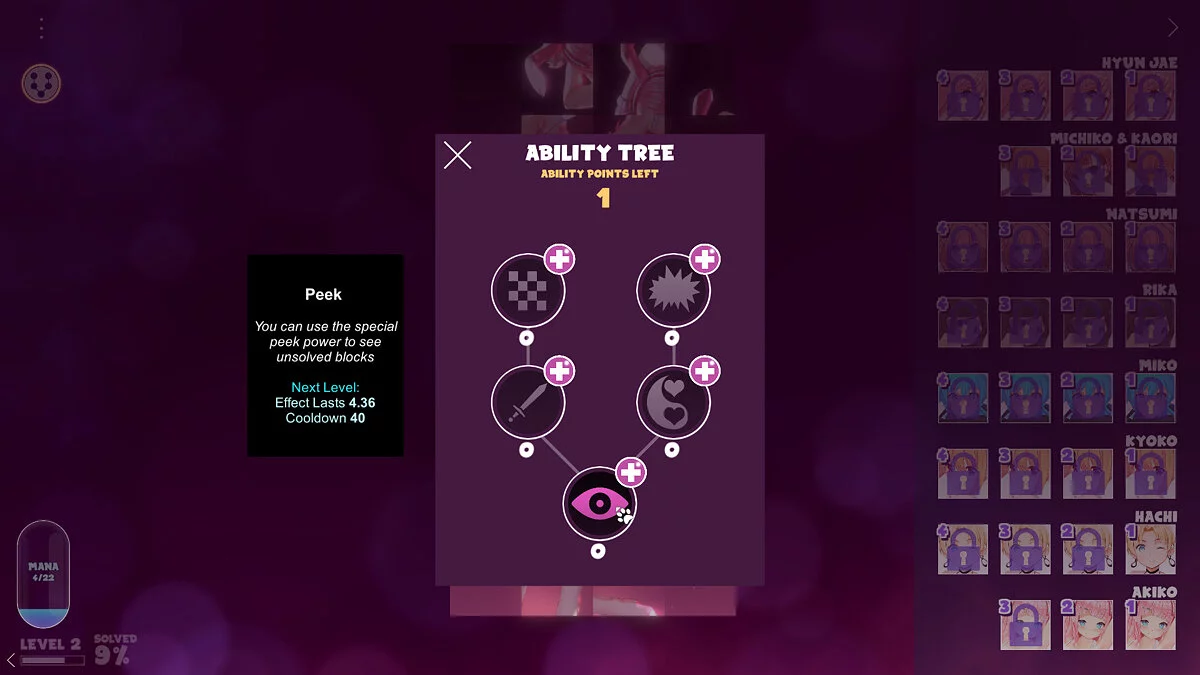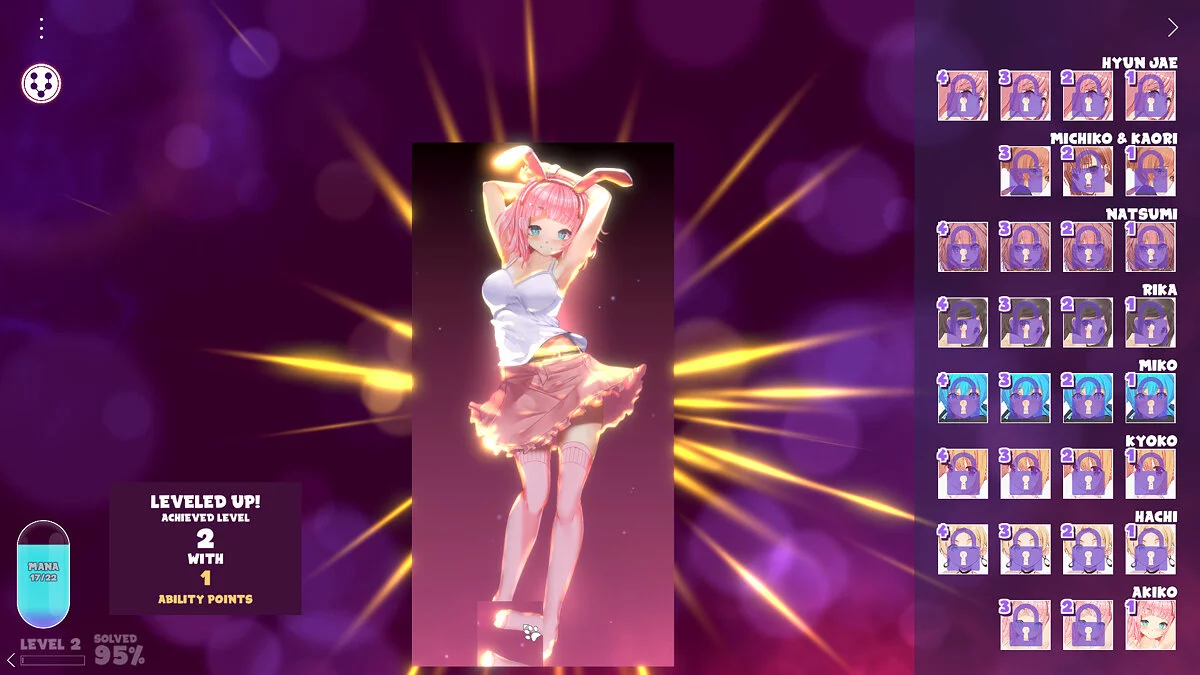 Также в Hentai Mosaique Puzzle невозможно проиграть, потому что на выручку всегда придут способности. При желании можно скрыть все меню и просто сосредоточиться на головоломке.
