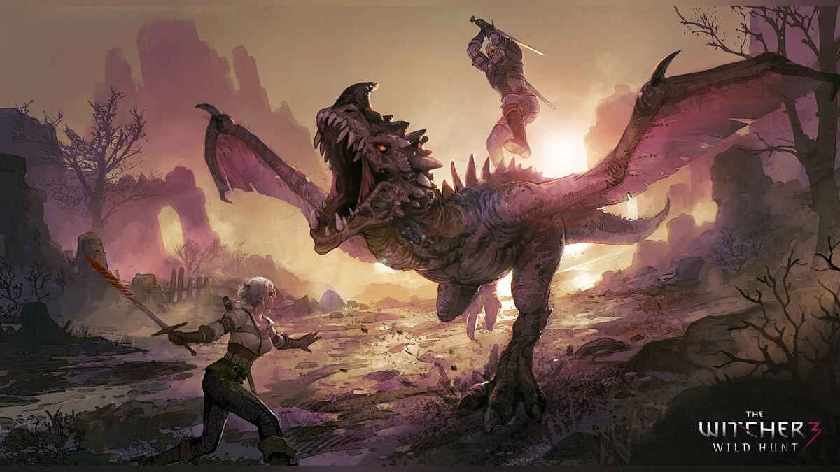 На изображении показано, как Геральт и Цири сражаются с монстром, который напоминает дракона. Надо признать, что выглядит это потрясающе.