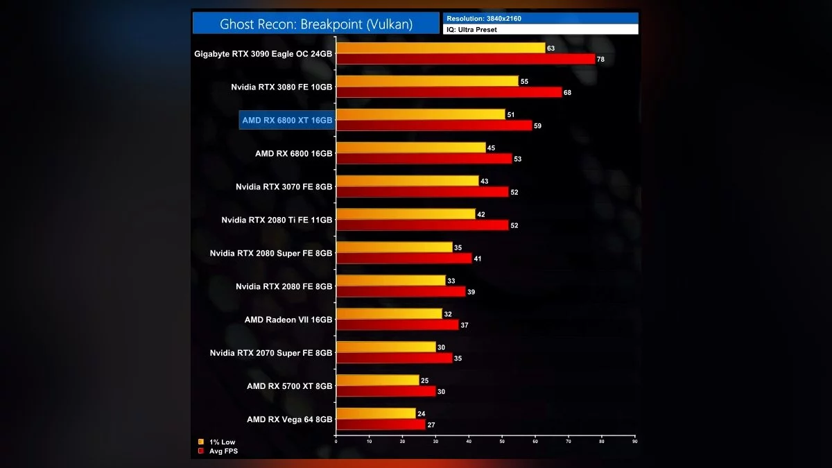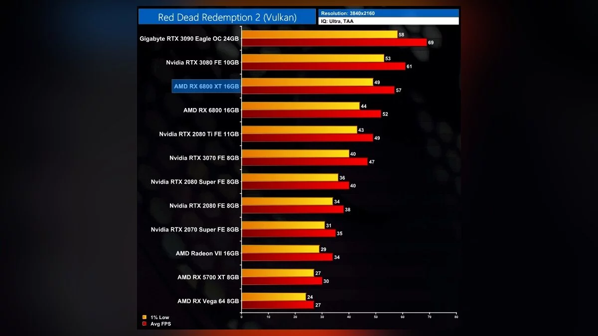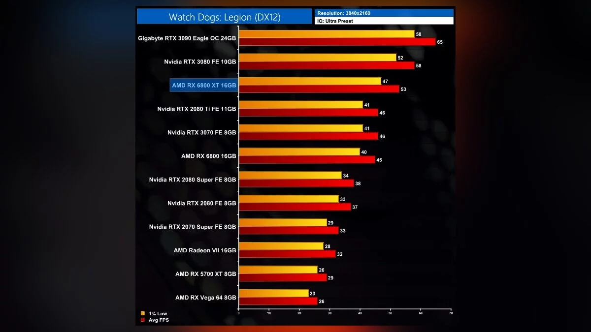 Отмечается, что AMD Radeon RX 6800XT быстрее RTX 3080 в Battlefield 5 при разрешении 1440p. А вот в Ghost Recon Breakpoint, Watch Dogs Legion и Red Dead Redemption 2 при 4K впереди RTX 3080.