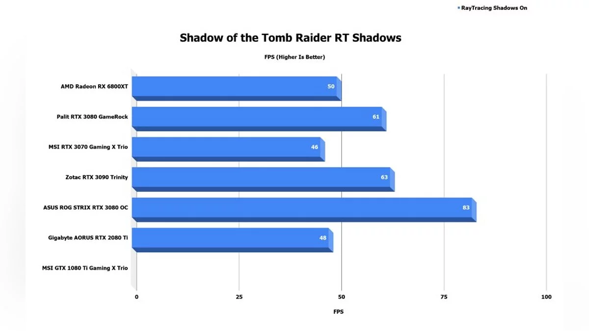 Подобная же ситуация наблюдается при включённой трассировке лучей. В Dirt 5 быстрее оказывается RX 6800XT. А вот в Shadow of the Tomb Raider и Metro Exodus «красный» флагман работает на уровне RTX2080 Ti. Также пока у AMD нет своей