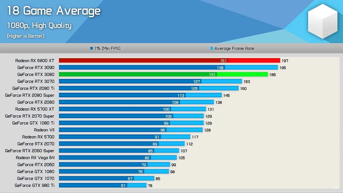 Хотя в большинстве сценариев 6800 XT немного уступает RTX 3080, однако есть и исключения. Это, к примеру, Assassin's Creed Valhalla. Однако такой результат не вызывает удивления — «Вальхалла» адаптирована под «красные» GPU.