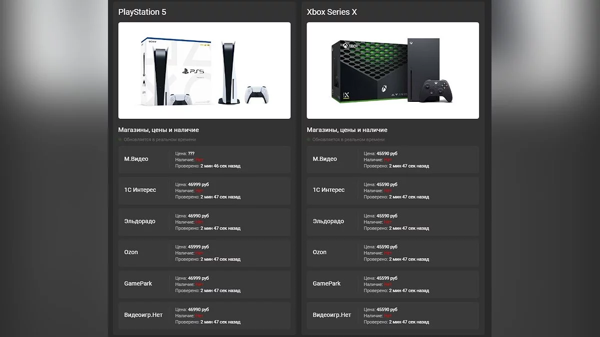 PlayStation 5 и Xbox Series X/S вышли совсем недавно, однако их тут же смели с прилавков. Проверять все магазины по отдельности — крайне сомнительное занятие, поэтому специально для вас мы сделали страничку, на которой можно отслеживать поступление консолей.