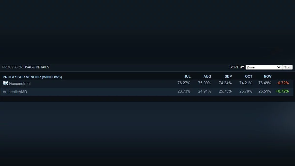 Что касается процессоров, то Intel все еще лидирует с большим отрывом: 73,49% пользователей используют решения «синей» команды. Доля AMD составила 26,51%, однако за месяц она выросла на 0,72%.